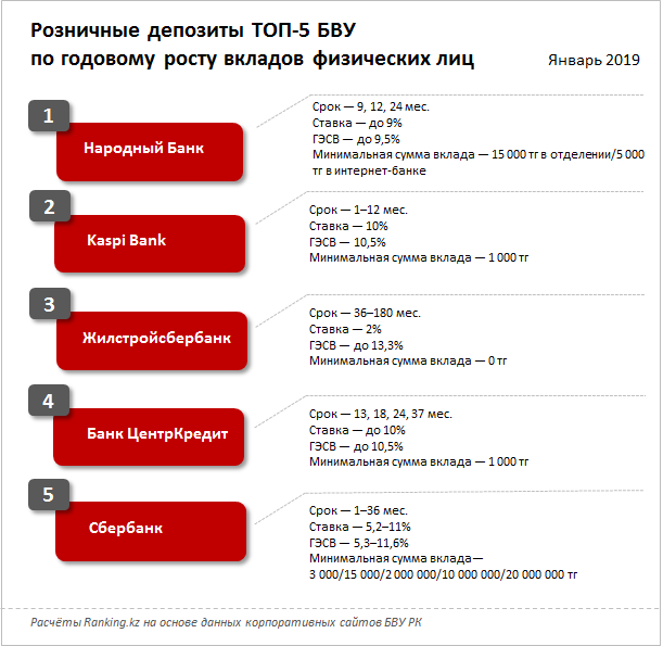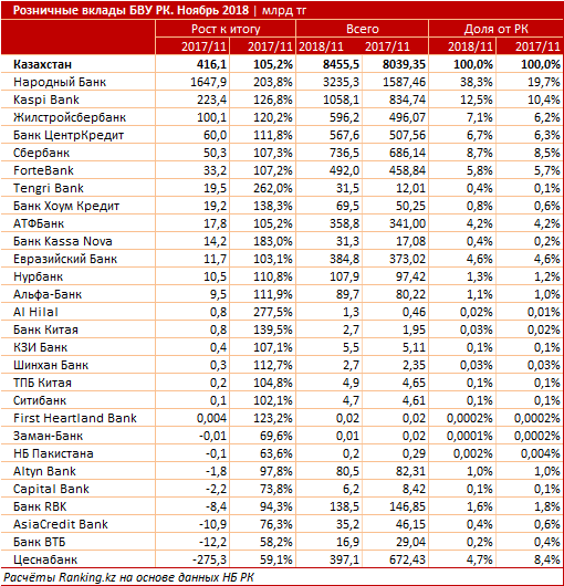 По годовому росту объёма розничных вкладов лидирует Народный Банк Казахстана. После приосоединения Qazkom банка рост розничных вкладов увеличился в два раза до 3,2 трлн тенге. Доля банка выросла с 19,7% до 38,3%.