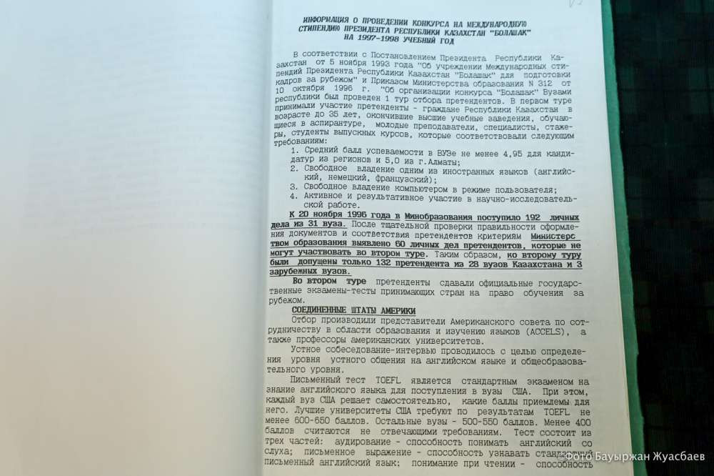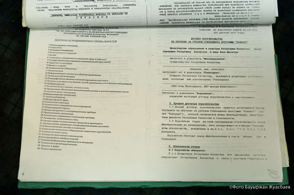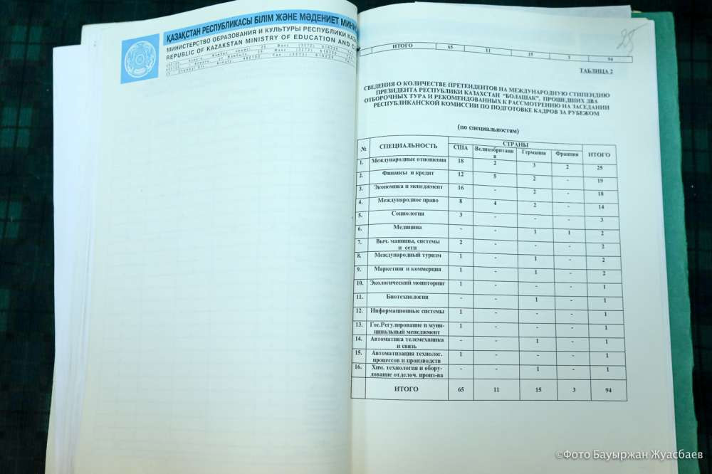 В архиве нам также показали документы по международной программе "Болашак". Тогда, как можно увидеть в этих материалах, в тройку дефицитных профессий в стране, на которые выделялась эта престижная стипендия в 1999-2000 годах, были международные отношения, социология и медицина.