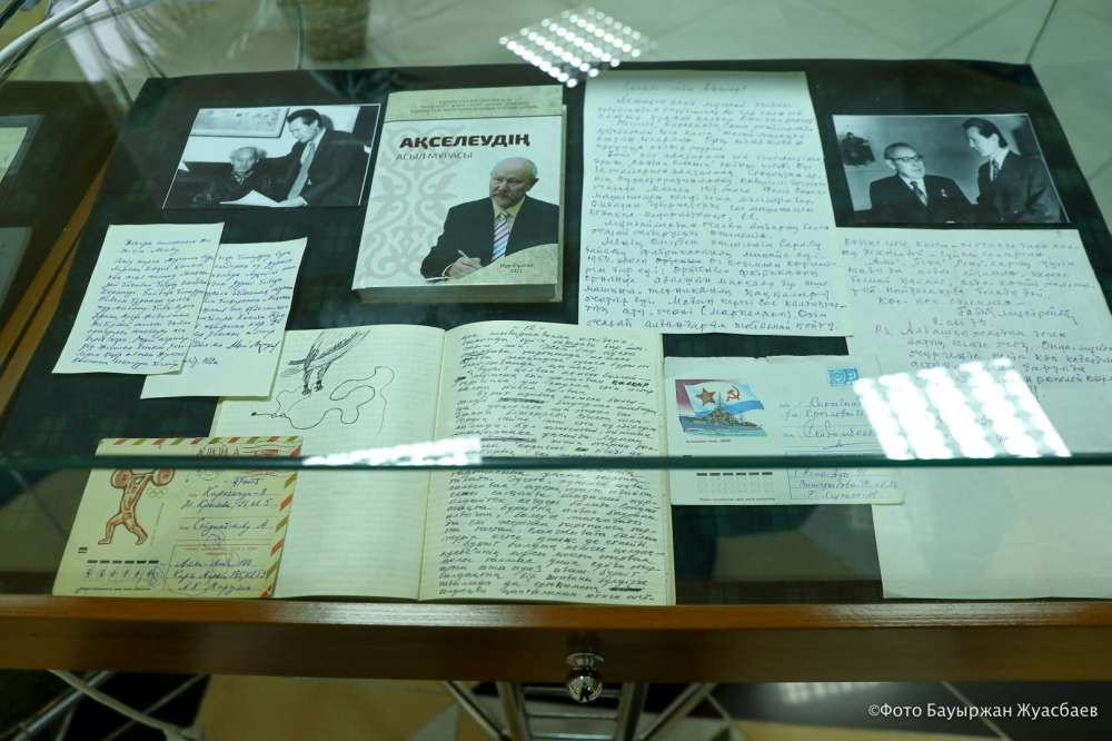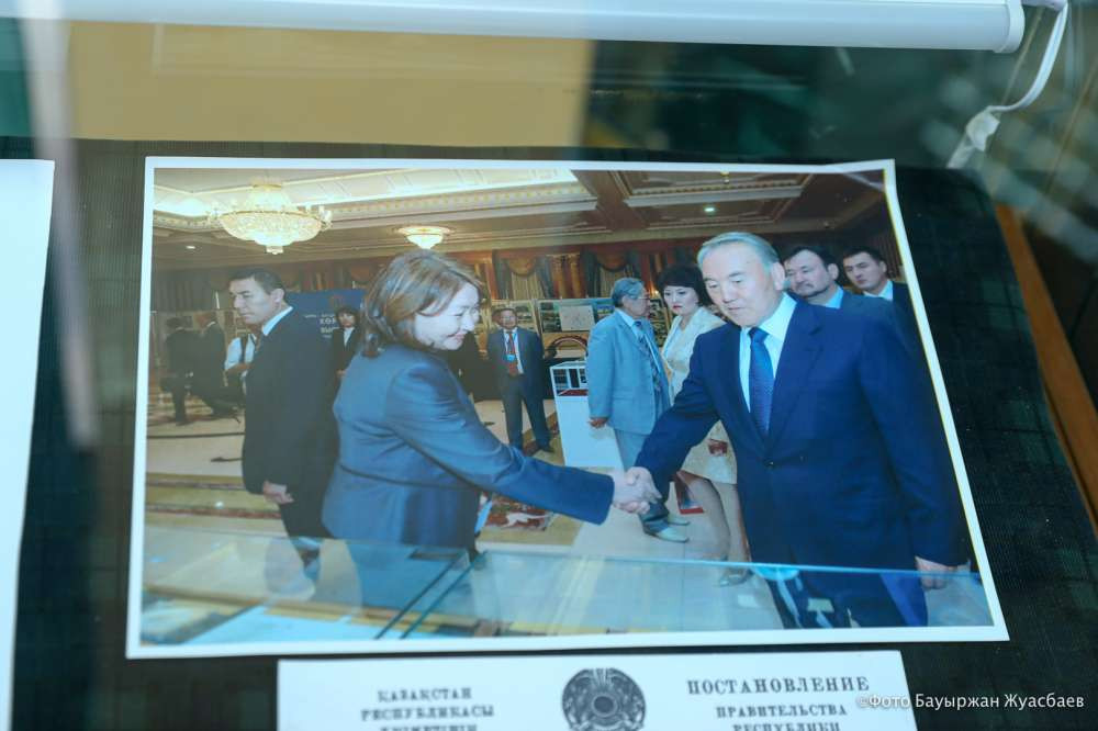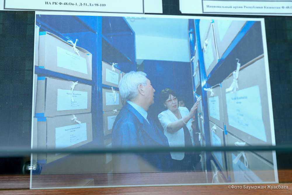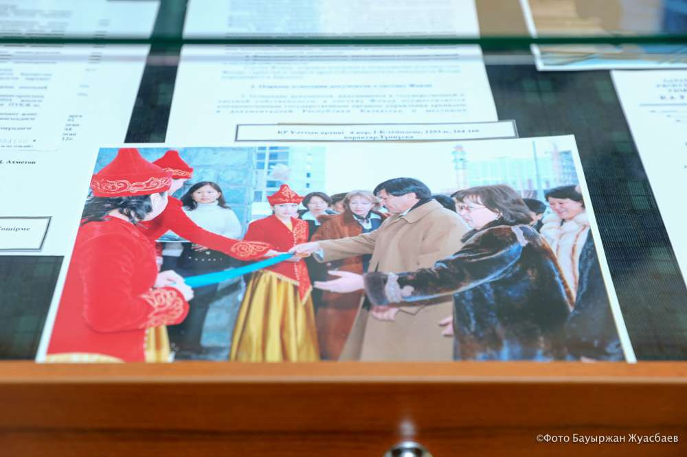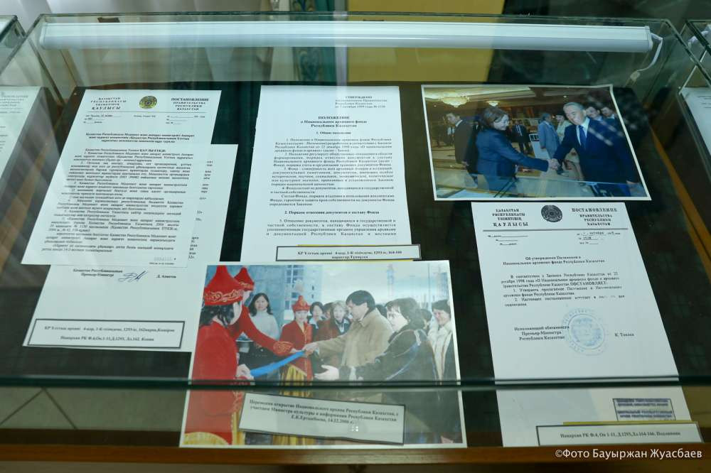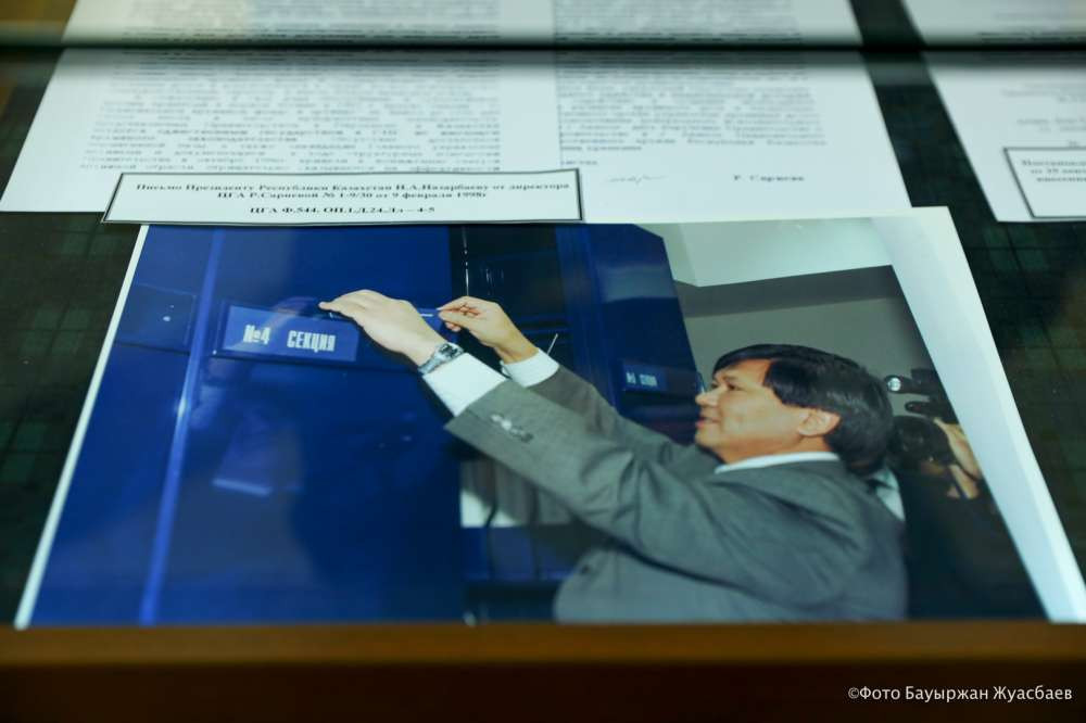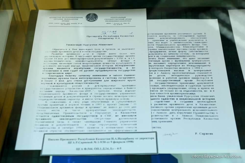 Отдельную витрину Нацархив посвятил истории своего учреждения. Важное место в этой экспозиции занимает письмо первого директора Рысты Сариевой Нацархива президенту, которое дало старт для создания одного из главных архивов страны.