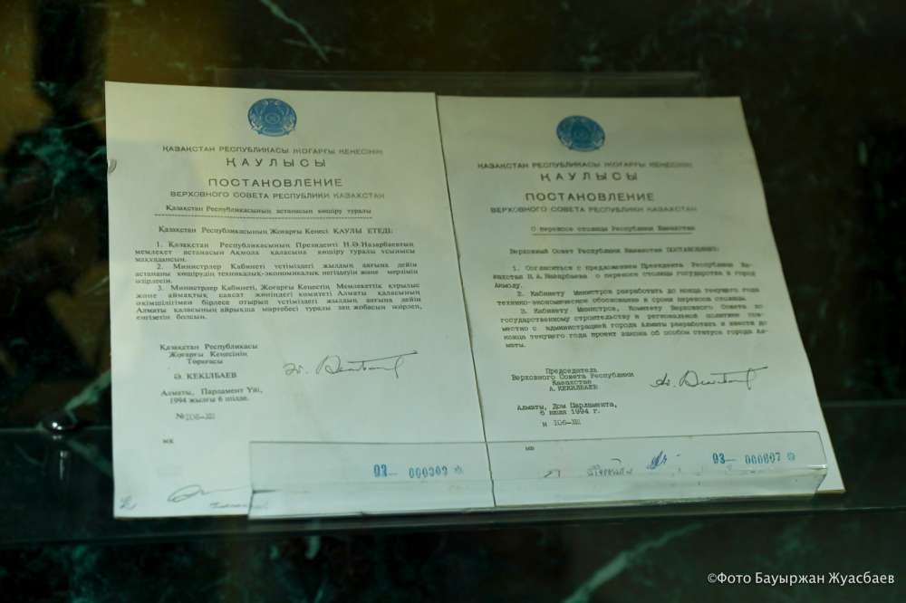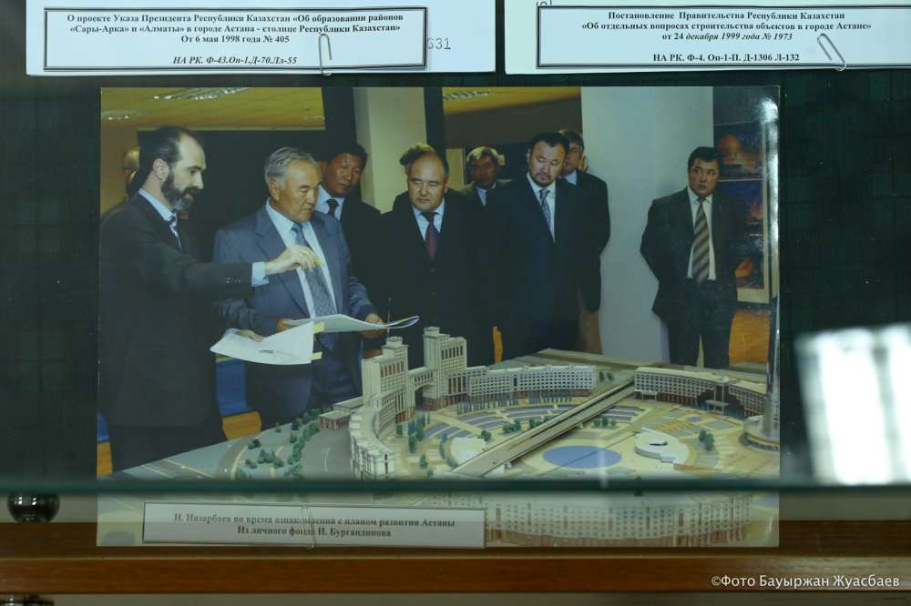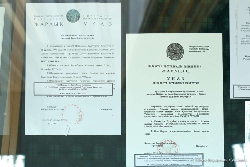 Представлены здесь и указы об объявлении Акмолы столицей, о переименовании Акмолы в Астану, об образовании в городе новых районов. Сначала это были районы Сарыарка и Алматы, далее появились Есиль и Байконур.
