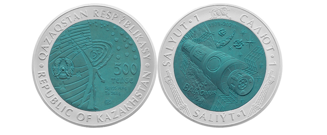 Изображение монет SALIÝT-1 из серебра и тантала, номиналом 500 тенге