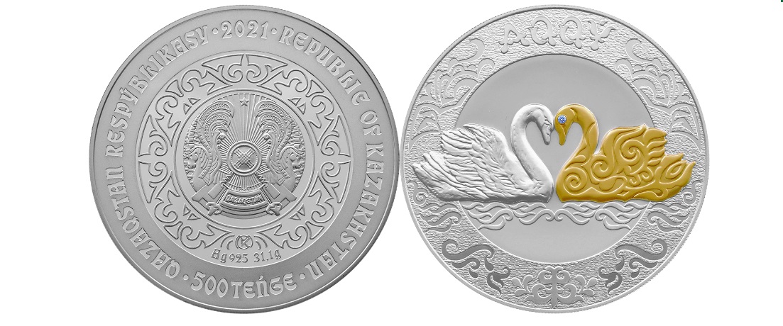 - из серебра 925/1000 пробы, массой 31,1 грамм, диаметром 38,61 мм, с одной вставкой из бриллианта диаметром 1 мм, качеством proof, номиналом 500 тенге, тиражом 4 000 штук;