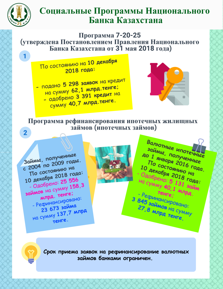 Наряду с этим, в рамках реализации социальных программ Национального Банка РК, по программе «7-20-25» регулятором принято 5 298 заявок на получение займа на сумму 62,1 млрд тенге. Из них одобрена 3 391 заявка на предоставление займа на сумму 40,7 млрд тенге.