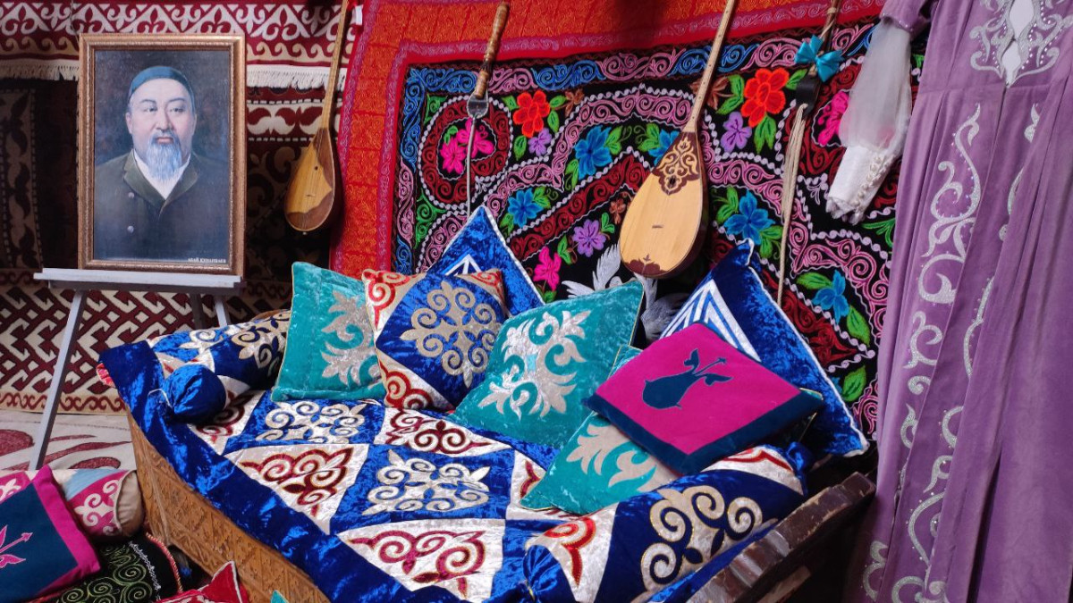 Университет имени Шакарима устроил в юрте настоящее погружение в культуру казахского народа, его быт и ремёсла. На стенах развесили национальную одежду, вдоль стены расставлена резная мебель, на сундуках уложены многочисленные корме – подушки и одеяла. Всё это передавало атмосферу, в которой жил и творил народный учитель и писатель Шакарим Кудайбердиев.