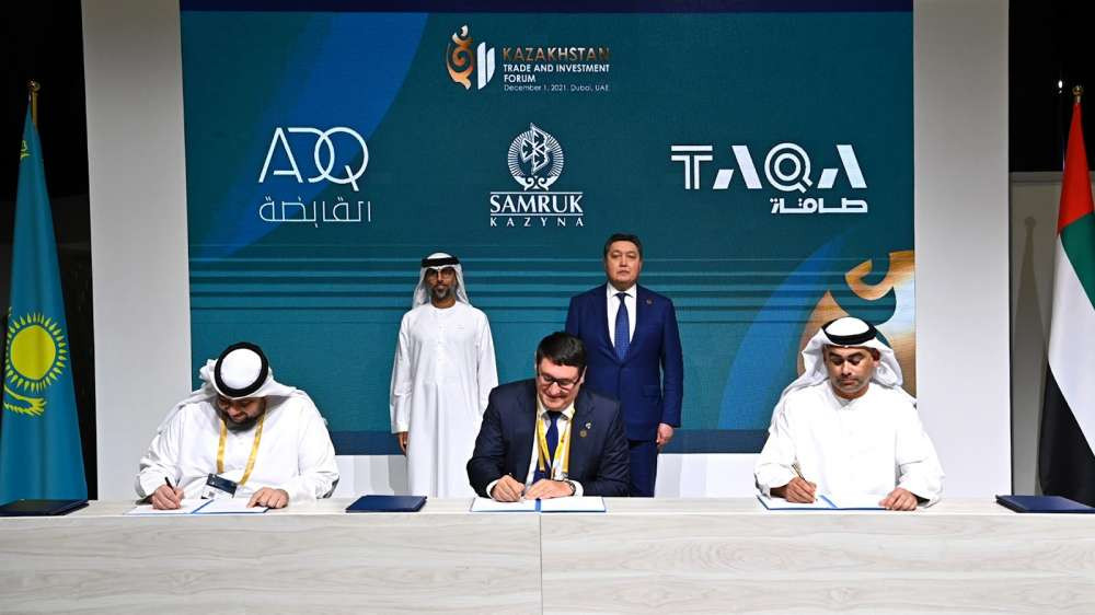 По итогам форума подписаны соглашение о стратегическом сотрудничестве между АО "Самрук-Қазына" и суверенным фондом Abu Dhabi Developmental Holding Company (ADQ), а также инвестиционные документы по строительству в РК солнечных и ветровых электростанций общей мощностью 4 ГВт.