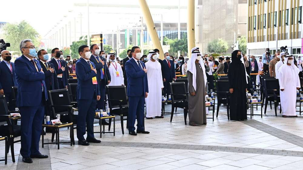 На центральной площади ЭКСПО Аль-Васл Плаза в присутствии премьер-министра РК Аскара Мамина и министра по вопросам толерантности и сосуществования, генерального комиссара EXPO-2020 Dubai шейха Нахайана бин Мубарака Аль Нахайана проведена церемония поднятия национального флага Республики Казахстан.