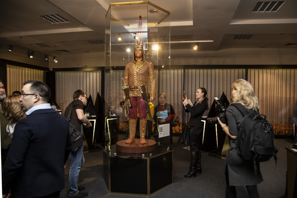 В кургане найдено свыше четырех тысяч золотых изделий: детали, декорировавшие одежду, а также украшения и бытовая утварь. Топография предметов в захоронении позволила исследователям в результате кропотливой работы воссоздать облик древнего воина, который представлен на выставке.