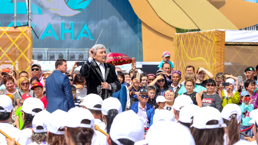 На сцену также вышли артисты Казахского государственного оркестра национальных инструментов им. Курмангазы, фольклорно-этнографического оркестра национальных инструментов "Отырар Сазы", оркестра национальных инструментов Государственной академической филармонии Астаны, академического оркестра народных инструментов им. Таттимбета, оркестра народных казахских инструментов Актау.