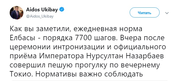 "Как вы заметили, ежедневная норма Елбасы - порядка 7700 шагов. Вчера после церемонии интронизации и официального приёма Императора Нурсултан Назарбаев совершил пешую прогулку по вечернему Токио. Нормативы важно соблюдать", - написал Укибай.