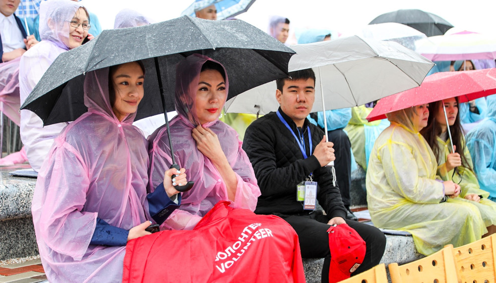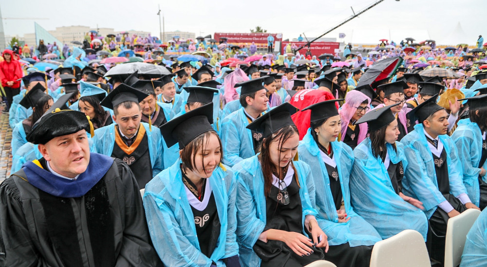 Торжественная церемония вручения проходила под открытым небом, однако проливной дождь внес свои коррективы, вынудив перенести церемонию в главный атриум Назарбаев Университета.