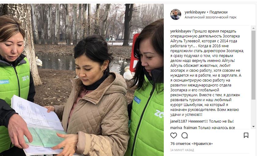 "Пришло время передать операционную деятельность зоопарка Айгуль Тулеевой, которая с 2014 года работала тут... Когда в 2016 мне предложили стать директором зоопарка, я сразу подумал о том, что первым делом надо вернуть именно Айгуль! Айгуль обожает животных, любит зоопарк и свою работу, хотя совсем не нуждается ни в работе, ни в зарплате. А я сконцентрирую свою работу на развитии международного отдела зоопарка и его глобальной реконструкции. Вместе с тем, я должен развивать туризм и наш любимый курорт Шымбулак, на который я назначен руководителем. Всем желаю удачи и успехов!!!" - написал Ержан Еркинбаев.