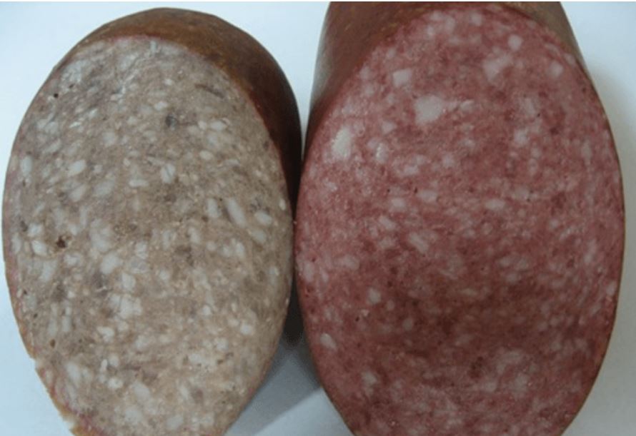 Фото: Цвет колбасы с нитритом натрия (справа) и без него