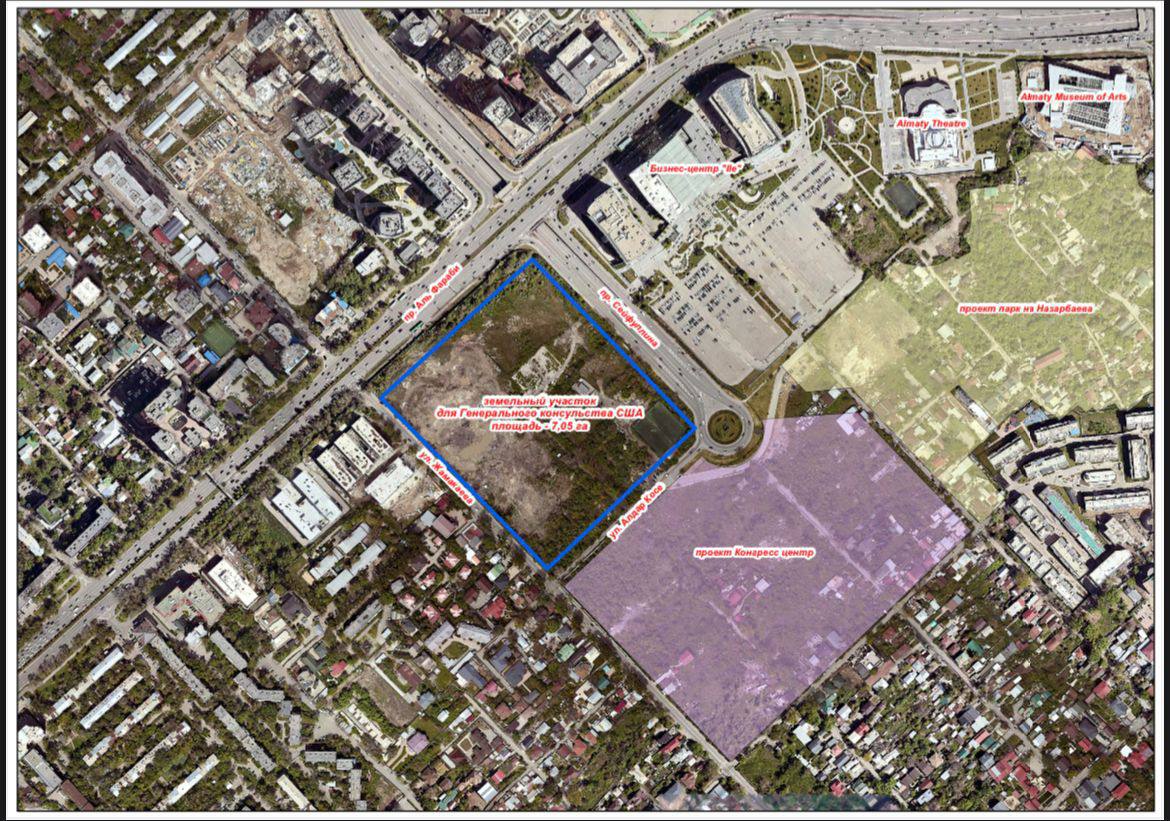 Акимат Алматы озвучил точную площадь и расположение земельного участка, отведенного под строительство нового здания Генерального консульства США, передает BAQ.KZ.