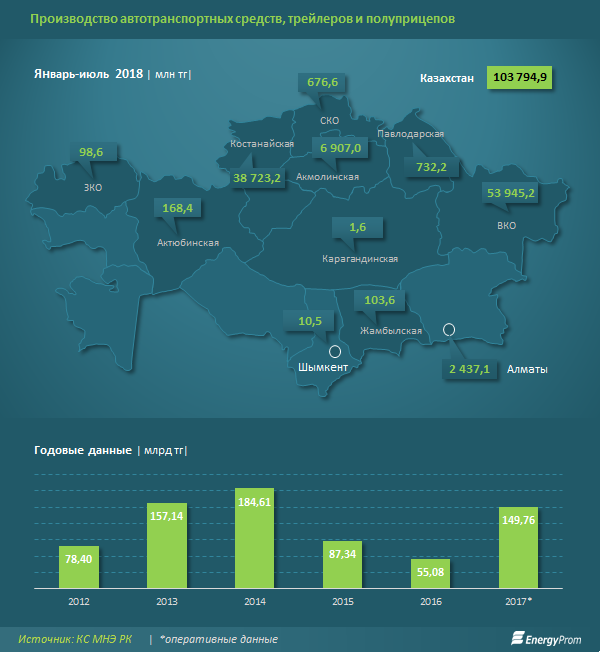 За семь месяцев на 103,8 млрд тенге выпущено автотранспортных средств, трейлеров и полуприцепов, что на 32,3% больше, чем год назад, сообщает Еnergyprom.kz.