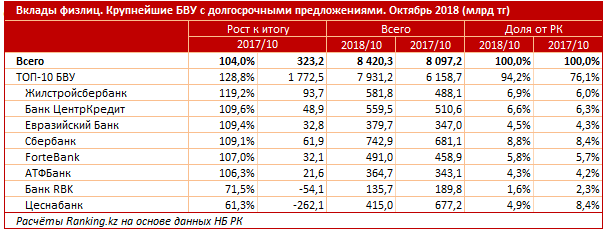 На втором месте Банк ЦентрКредит (+9,6% за год, до 559,5 млрд тенге), на третьем — Евразийский Банк (+9,4%, до 379,7 млрд тенге по итогам октября).