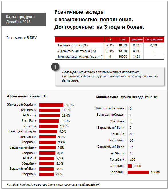 Отметим, еще два банка — Народный банк и Kaspi Bank — также в плюсе: Kaspi Bank за год нарастил портфель более чем на четверть, а Народный банк (за счёт поглощённого Казкоммерцбанка) — почти вдвое. Впрочем, эти банки не предлагают своим клиентам долгосрочные многолетние депозиты в рассматриваемом сегменте.