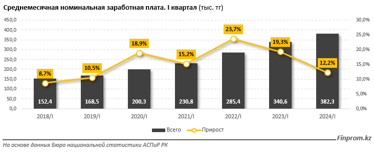 Для сравнения: в аналогичном периоде прошлого года среднемесячная зарплата составляла 340,6 тыс. тг, плюс 19,3% за год.