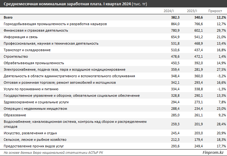 В разрезе отраслей больше всего традиционно получают работники в горнодобывающей промышленности и разработке карьеров: здесь средняя номинальная зарплата составила 864 тыс. тг, на 12,7% больше, чем годом ранее.