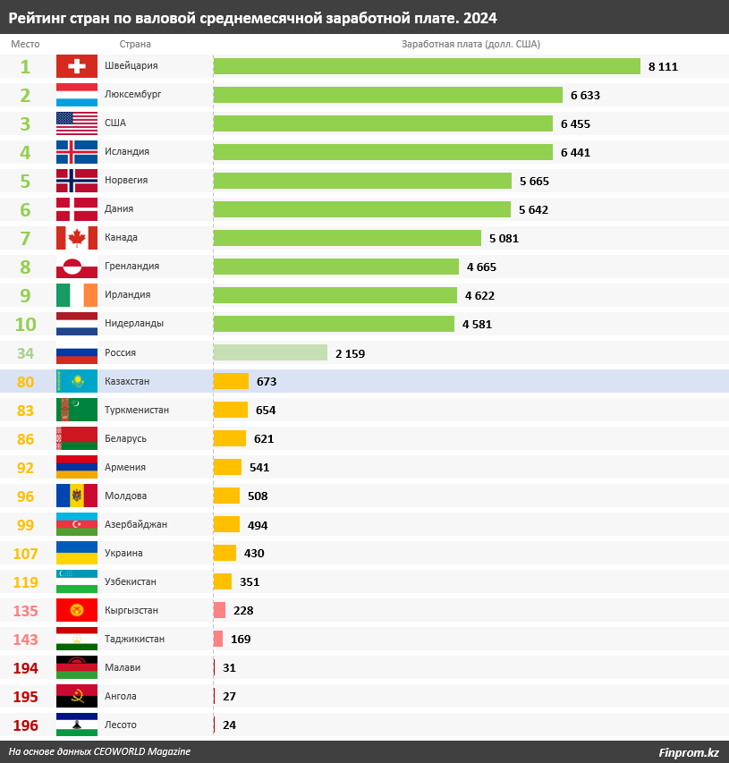 В рейтинге стран по валовой среднемесячной заработной плате, по данным CEOWORLD Magazine, Казахстан на начало 2024 года оказался на 80-м месте из 196 в мире. Заработная плата в стране составила 673 долл. США.