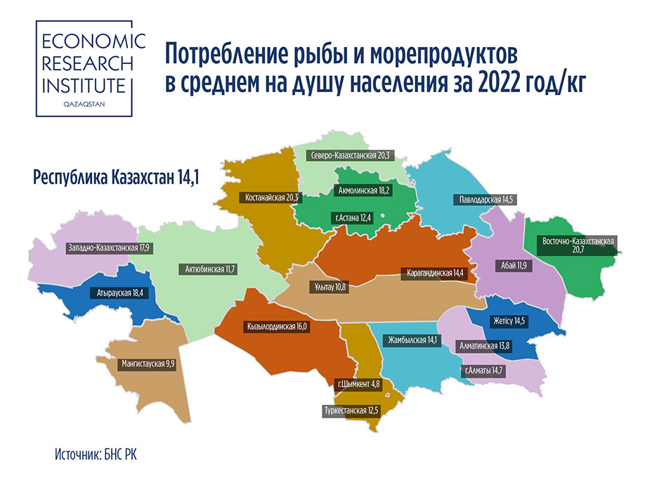 По данным Бюро национальной статистики РК, средний объем потребления рыбы и морепродуктов на одного казахстанца в 2022 году составил 14,килограмма, что на 4,7% меньше, чем в 2021 году.