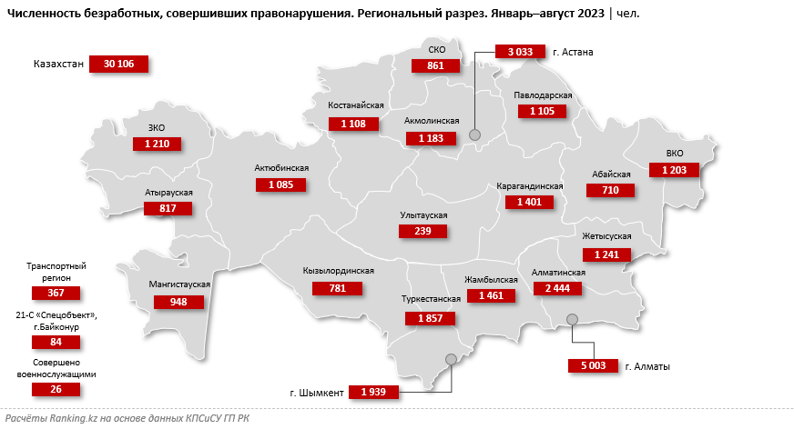 Сообщается, что больше всего безработных, совершивших уголовные правонарушения, - в Алматы. В тройку регионов-антилидеров также вошли Астана и Алматинская область. Наименьшие показатели были зафиксированы в Улытауской, Абайской и Кызылординской областях.