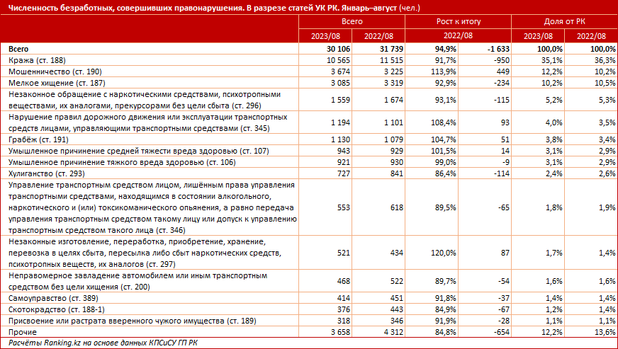 Согласно статистике, предоставленной Ranking.kz, наиболее "популярное" правонарушение среди безработных - это кража. На втором месте - мошенничество , на третьем - мелкое хищение. Также часто безработные попадались за незаконное обращение с наркотическими средствами без цели сбыта и за нарушение правил дорожного движения или эксплуатации транспортных средств.