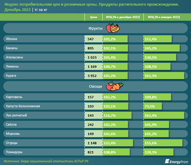 Среди овощей заметный годовой рост показали цены на репчатый лук (сразу на 62,4 процента, до 143 тенге), огурцы (на 55,6 процента, до 1,1 тысячи тенге), помидоры (на 20,3 процента, до 821 тенге), картофель (на 9,8 процента, до 157 тенге), свёклу (на 1,9 процента, до 242 тенге) и морковь (на 1,2 процента, до 149 тенге).