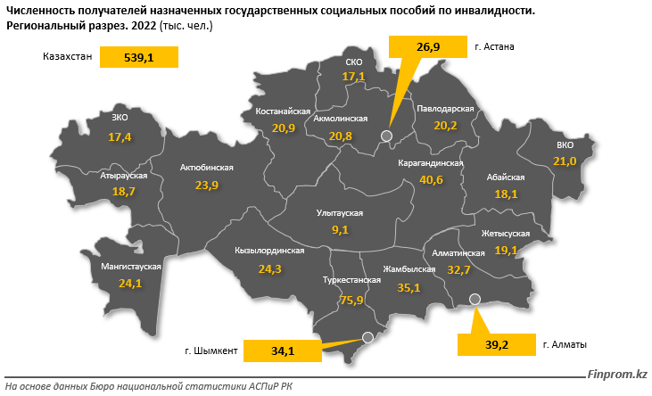 "Больше всего получателей государственных пособий ожидаемо проживало в густонаселённой Туркестанской области: 75,9 тысячи человек, минус 0,7 процента за год. Далее идут Карагандинская область (40,6 тысячи человек, минус 18,3 процента за год) и Алматы (39,2 тысячи человек, плюс 5,1 процента). Отметим, что такое заметное сокращение показателей в Карагандинской области обусловлено делением региона в середине 2022 года на Карагандинскую и Улытаускую области. Меньше всего получателей соцпособий по инвалидности насчитывалось в Улытауской, Северо-Казахстанской и Западно-Казахстанской областях", - говорится в сообщении.