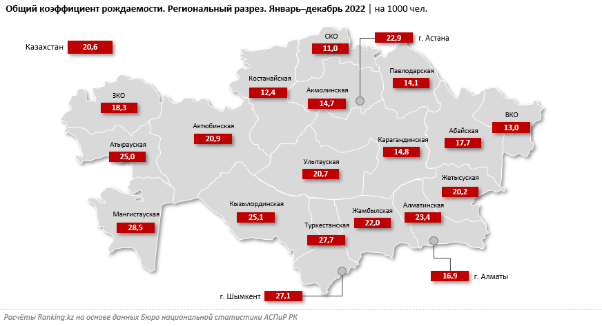 На первом месте в рейтинге регионов по коэффициенту рождаемости в 2022 году была Мангистауская область с показателем 28,5. Напомним: в среднем по республике этот коэффициент составил 20,6. Второе место заняла густонаселённая Туркестанская область (27,7), третье - Шымкент (27,1). Среди регионов - аутсайдеров по рождаемости оказались Северо-Казахстанская (11), Костанайская (12,4) и Восточно-Казахстанская (13) области.
