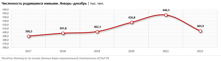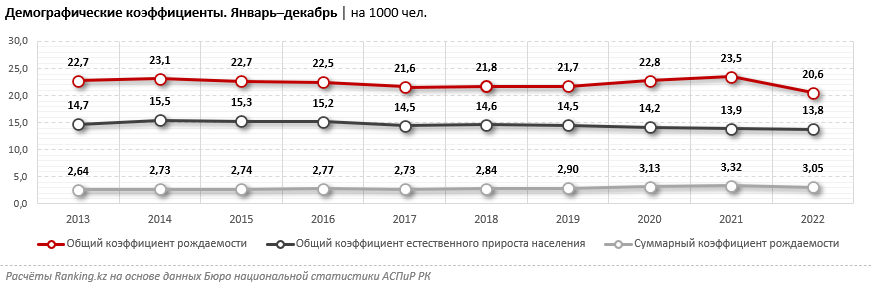 Общий коэффициент рождаемости в 2022 году составил 20,6, против 23,5 в 2021 году. По этому индикатору, характеризующему соотношение численности новорождённых к общей численности населения, Казахстан вернулся к показателю 15-летней давности. В 2007 году этот коэффициент был равен 20,8. Впрочем, здесь важно понимать, что такой скачок показателя объясняется именно беби-бумом двух предыдущих лет, который прибавил к населению страны сразу 873 тысячи младенцев. Население стремительно выросло, и соотношение этой новой цифры с численностью рождённых в 2022 году дало такой результат.