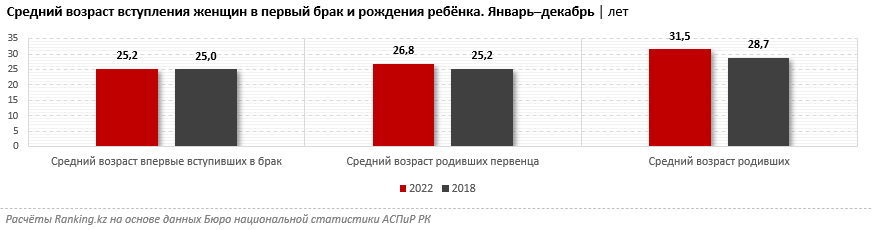 Во-вторых, в связи с урбанизацией и постепенно меняющейся социальной ролью женщины в стране увеличивается возраст вступления девушек в первый брак. Это в свою очередь сдвигает возрастные сроки рождения детей. Если в 2018 году возраст рожениц в среднем по стране составлял 28,7 года, то к концу 2022 года он увеличился до 31,5 года. А в городах этот показатель был ещё выше: в 2018 году - 29 лет, в 2022 году - 31,9 года. В крупных городах женщины рожали в целом на пару лет позже: в Астане - в 32,5 года, в Алматы - в 32,3 года.