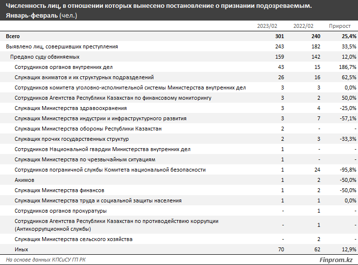 Среди служащих государственных органов на коррупционных преступлениях чаще всего попадались сотрудники органов внутренних дел: 43 человека, против 15 годом ранее. Далее идут служащие акиматов и их структурных подразделений (26 человек), сотрудники комитета уголовно-исполнительной системы министерства внутренних дел (три человека) и Агентства по финансовому мониторингу (три человека), служащие министерства здравоохранения (три человека) и министерства индустрии и инфраструктурного развития (также три человека).