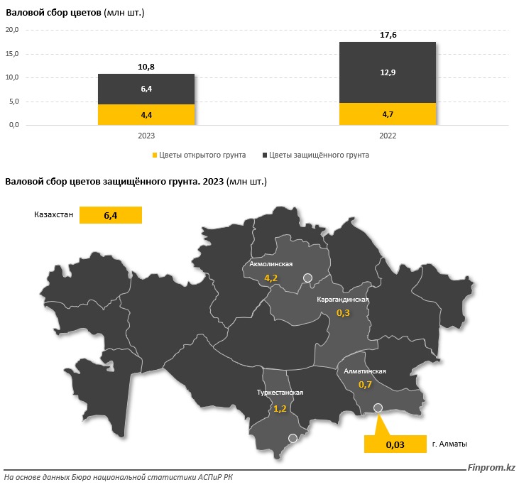 Детализация информации по валовому сбору цветов в региональном разрезе показывает, что в прошлом году ситуация действительно значительно ухудшилась именно на юге. Главный удар пришёлся на Алматинскую область, где сбор цветов уменьшился в 10,8 раза, с 7,8 миллиона до 716 тысяч штук в год. Таким образом, регион лишился статуса главного поставщика тепличных цветов. Первенство по этому виду растениеводства перешло к Акмолинской области, несмотря на то, что эта территория уступает югу по климатическим условиям. В промышленных теплицах близ столицы в прошлом году срезали 4,2 миллиона цветов.