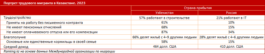 Специалисты определили потрет трудового мигранта, приезжающего в Казахстан для работы. Результаты по мигрантам из Узбекистана и России получились разными. Больше половины приезжих из Узбекистана работают в РК на стройке и являются единственными кормильцами своей семьи. Несмотря на то, что средняя зарплата у них и так намного ниже средней номинальной по Казахстану — всего 213 тыс. тг, — они отправляют 25%–50% этих денег домой, своим семьям. Ещё 32% узбекских мигрантов переводят домой более 50% своих доходов. За первый квартал текущего года общий объём переведённых из Казахстана в Узбекистан средств достиг 29,7 млрд тг. Информация об этом публиковалась на нашем сайте в начале мая. По показателю международных денежных переводов, отправленных за рубеж, Узбекистан занимает третье место после России и Турции.