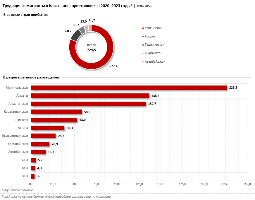 .За 2020–2023 годы в Казахстан приехали на заработки 724,5 тыс. трудовых мигрантов. Согласно этим оценочным данным, 79,7% из них, или 577,4 тыс. человек, прибыли из Узбекистана, 4,2%, или чуть более 30 тыс. человек — из Таджикистана. Россиян относительно немного: 68,2 тыс. человек, или 9,4%.