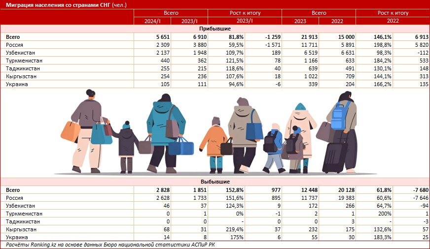 Согласно отчётам Бюро национальной статистики (БНС) АСПиР РК, в прошлом году численность мигрантов, переезжающих в Казахстан на постоянное место жительство из стран Центральной Азии, выросла на 10,4% — с 8,5 тыс. до 9,3 тыс. человек. В первом квартале 2024-го тенденция сохранилась: плюс 11,8% к аналогичному периоду прошлого года. Статистика показывает, что в 2023 году россияне составляли самую многочисленную группу эмигрирующих в РК (11,7 тыс. чел.). Суммарная численность мигрантов из Узбекистана, Кыргызстана, Таджикистана и Туркменистана была в пределах 9,3 тыс. человек. За январь–март этого года численность переезжающих из РФ уменьшилась на 40,5%, а наибольшую по численности группу прибывающих теперь совокупно составляют граждане четырёх стран ЦА.