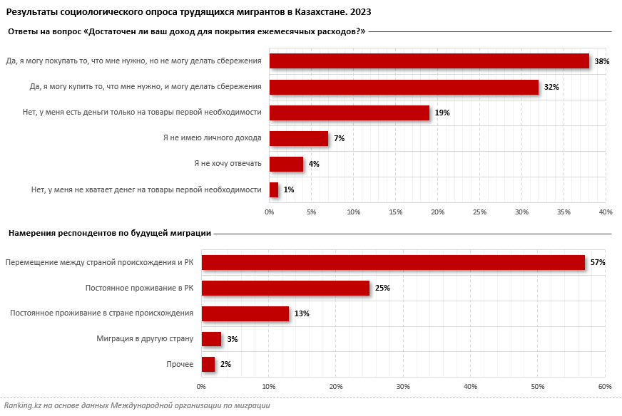 Несмотря на непростые условия жизни и работы на чужбине, большая часть трудящихся мигрантов пока не хотят перемен. 57% респондентов говорят, что в будущем также намерены перемещаться между своей страной и Казахстаном, а 25% намерены постоянно жить в РК. Лишь 13% хотели бы уехать домой.