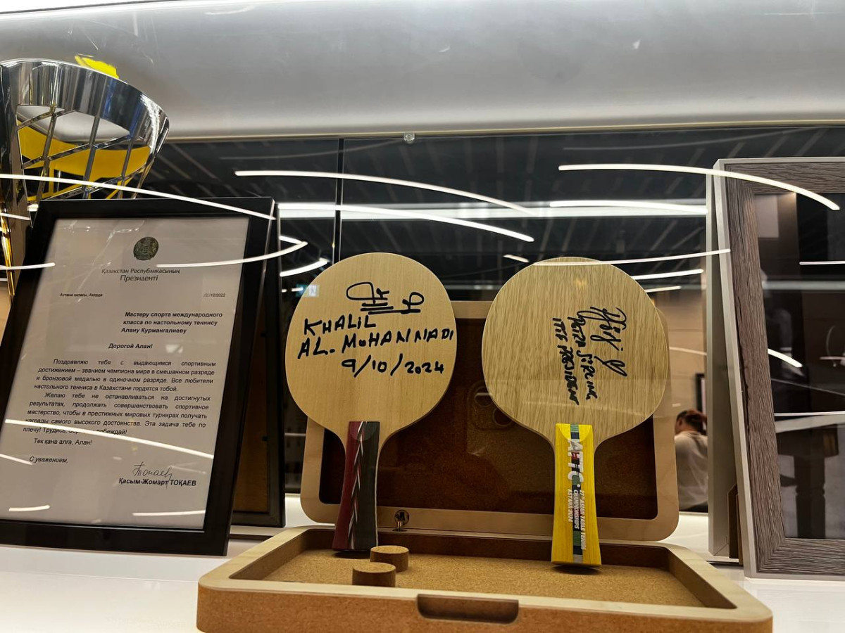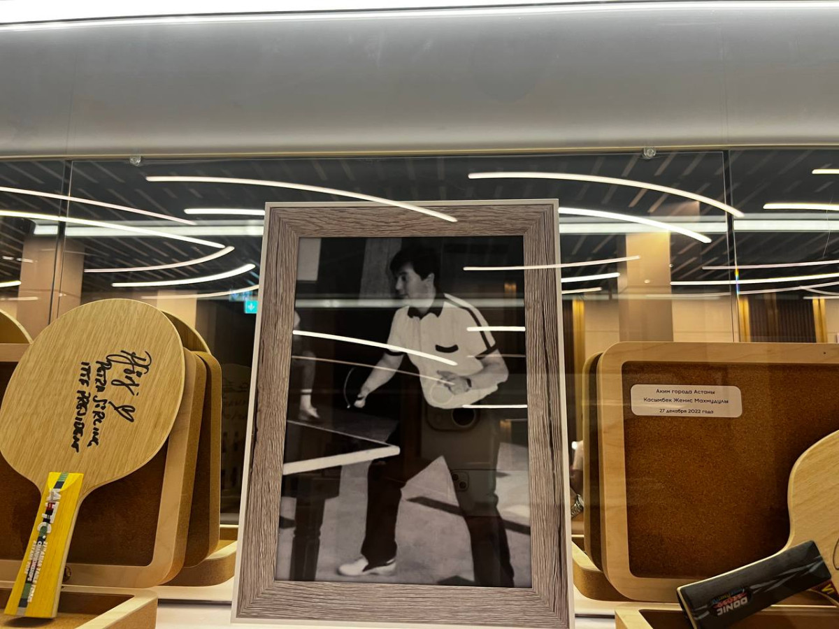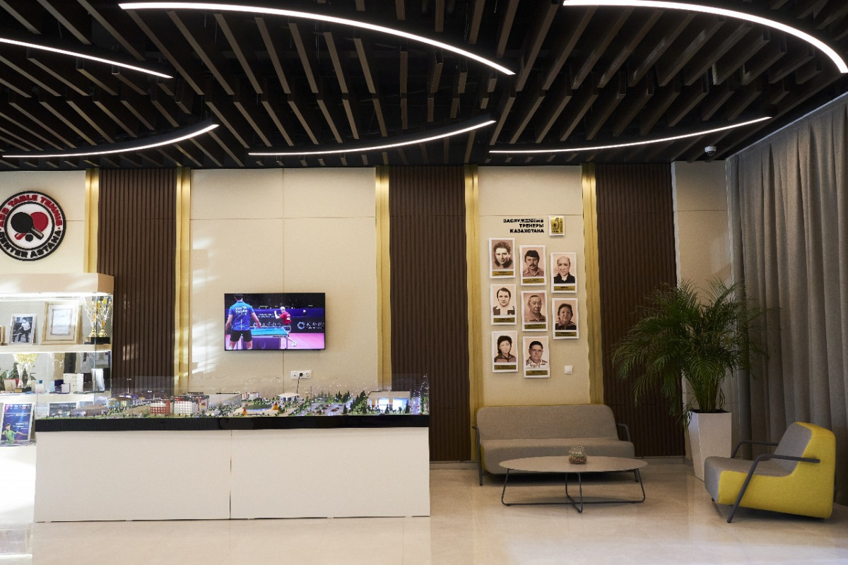 Уже на ресепшне центра внимание привлекают выставленные кубки, сувениры и другие значимые предметы для комплекса. Здесь же размещена фотография, на которой президент Казахстана Касым-Жомарт Токаев играет в настольный теннис с президентом Турции Реджепом Эрдоганом - символический знак внимания к развитию этого вида спорта.