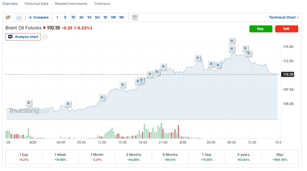 По состоянию на утро 30 апреля 2026 года стоимость нефти марки Brent резко выросла, превысив отметку в 120 долларов за баррель. В отдельные моменты цена поднималась выше 126 долларов.