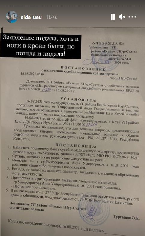 По словам Аиды, очевидцы пытались ей помочь и успели сфотографировать нападавшего, пока он убегал. После нападения у девушки остались отметины и кровоподтеки на ногах. Несмотря на это, Аида поехала в управление полиции столичного района Есиль и написала заявление на нападавшего.
