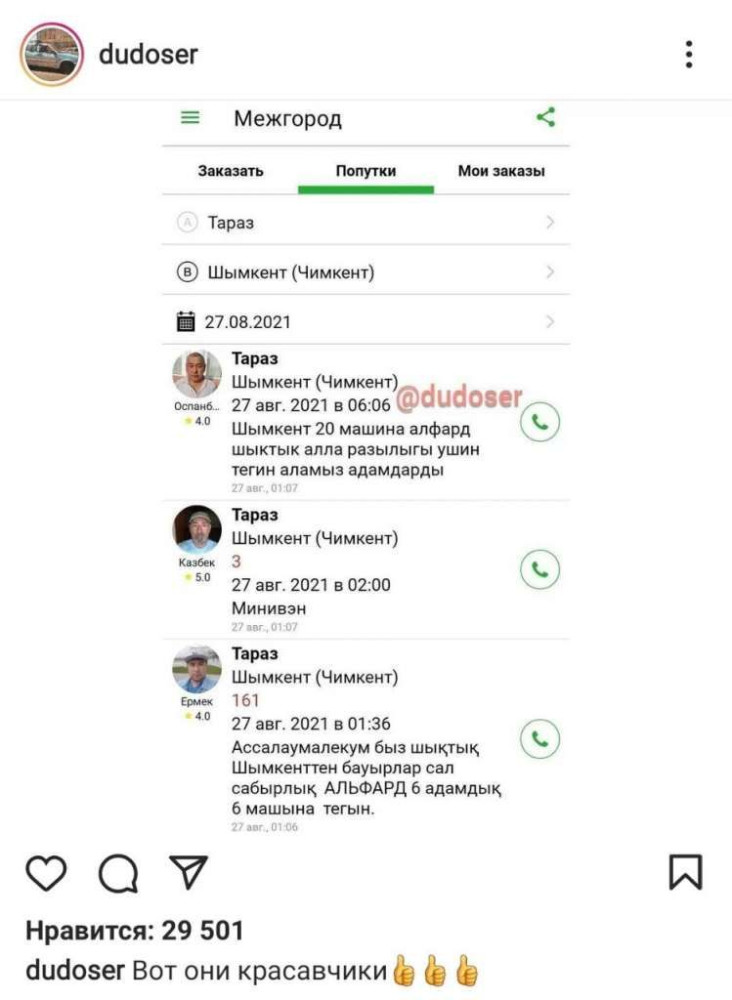 Кроме того, Instagram-паблик dudoser рассказал о том, как водители Тараза готовы бесплатно отвезти пострадавших в Шымкент.