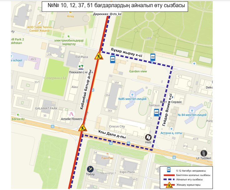 “До завершения ремонтных работ, временно изменены схемы движения маршрутов №№ 10, 12, 37, 51, 53, 302, 303, 308, 309, 320, 323. Просим заранее планировать свой маршрут”, - сообщили в ТОО "City Transportation Systems".