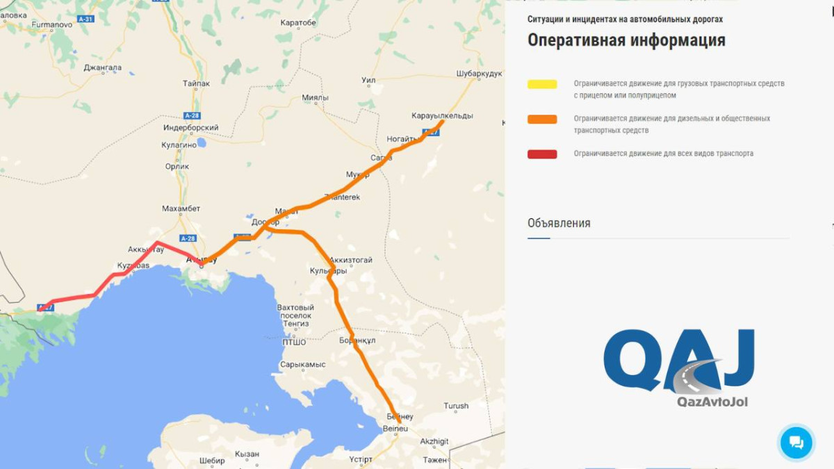 В Мангистауской области ограничили движение для общественного транспорта по дороге "Доссор-Кульсары-Бейнеу-Сай Утес-Шетпе-Жетыбай-Актау" (км. 210-217), участок от границы Атырауской области до села Бейнеу.