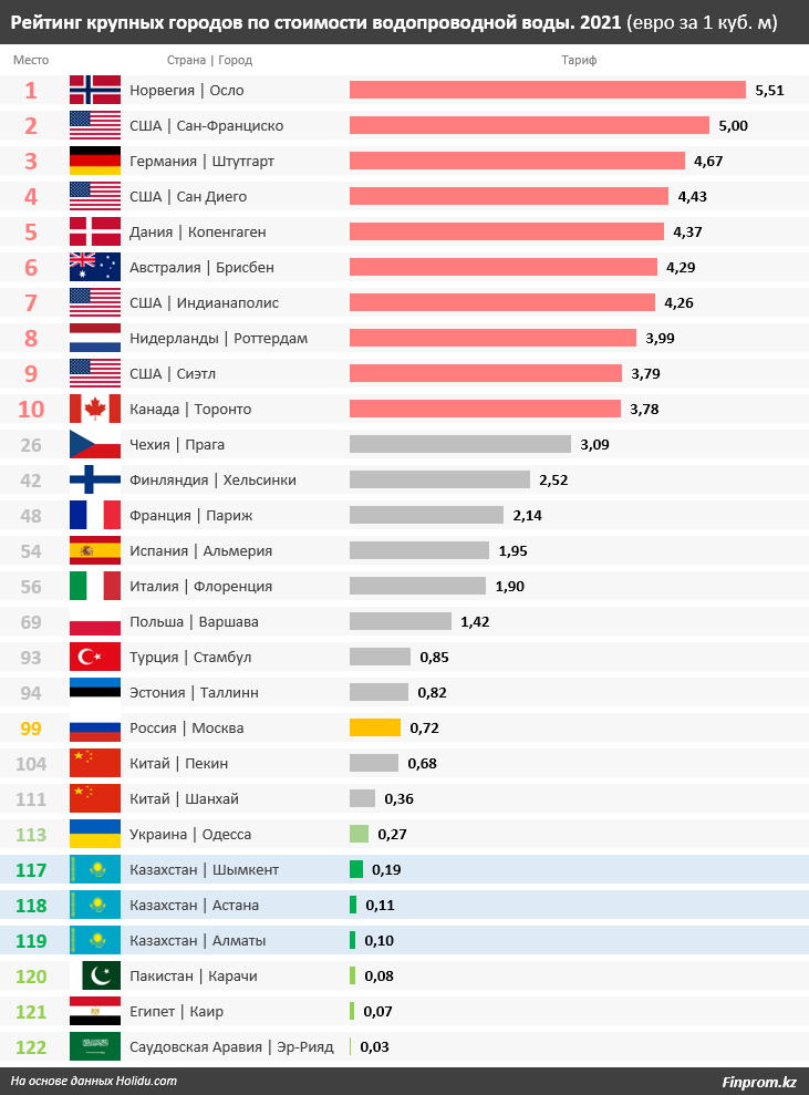 Если сравнить с городами, попавшими в мониторинг, три ключевых казахстанских мегаполиса, Шымкент, Астану и Алматы, то в рейтинге из 123 городов они соответственно займут лишь 117-е, 118-е и 119-е места со стоимостью кубометра воды в 0,19, 0,11 и 0,1 евро. То есть, водопроводная вода в Казахстане — одна из самых дешёвых в мире.