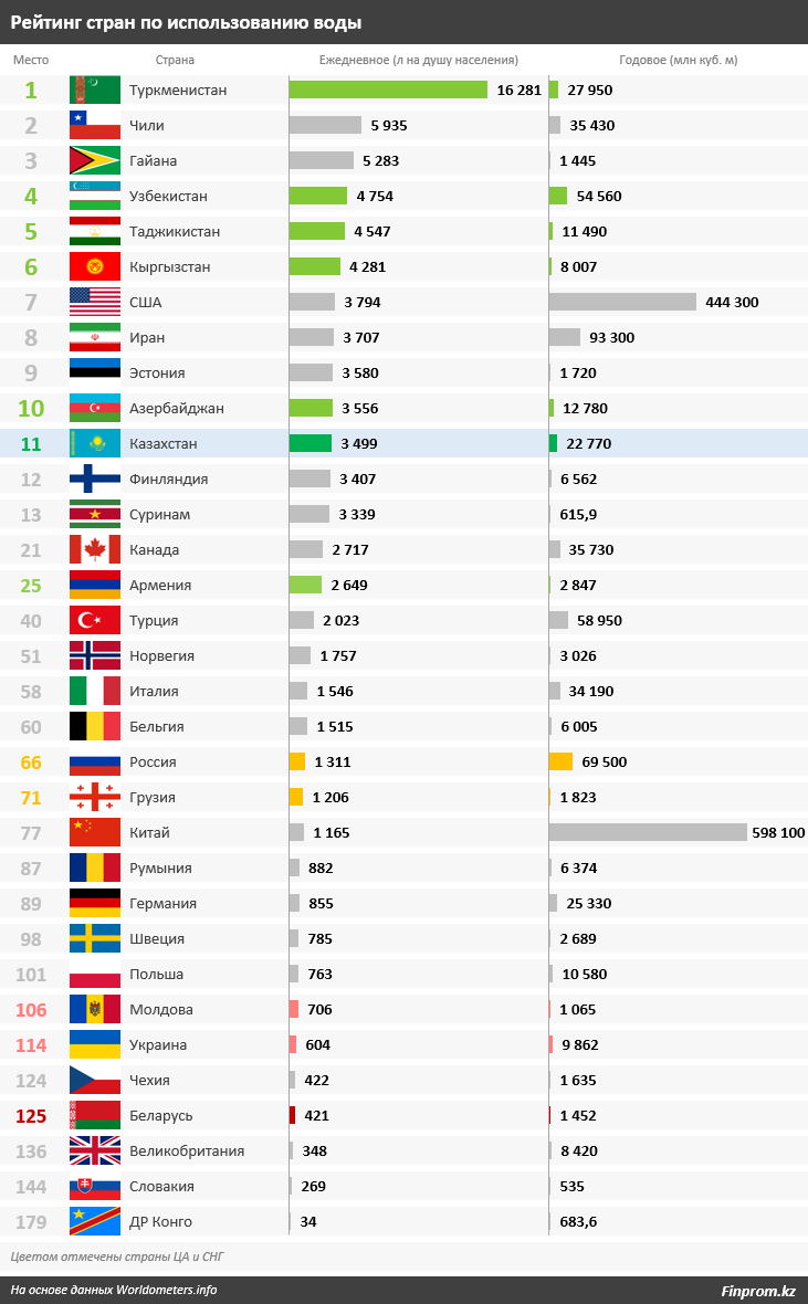 "Лидирует" же по потреблению воды ещё одна страна Центральной Азии - Туркменистан: 16,3 тыс. литров воды в день на душу населения. В тройку главных "стран-водопользователей" попали два южноамериканских государства — Чили и Гайана. За ними идут сразу три страны ЦА — Узбекистан, Таджикистан и Кыргызстан: 4,8 тысячи, 4,5 тысячи и 4,3 тысячи литров воды на душу населения в день соответственно. Седьмую строчку занимают США с показателем в 3,8 тысячи литров на человека.