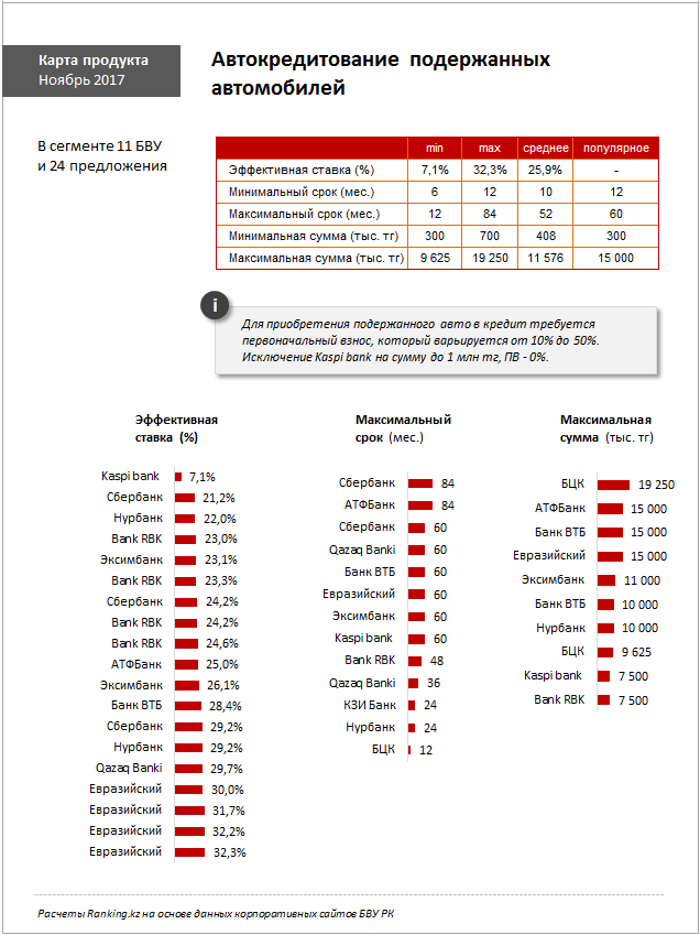 Автокредит на подержанные автомобили выдают 11 из 32 банков второго уровня. Требования по возрасту к приобретаемому автомобилю указали 6 банков - от 5 (Нурбанк) до 15 (Евразийский) лет, Kaspi указал, что кредитует автомобиль любого года выпуска.