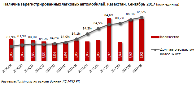 Число прошедших регистрацию легковых автомобилей за год выросло на 1,8% (68,4 тыс). Так на конец сентября в РК их количество составило 3,92 млн. Старые машины, с возрастом более трех лет, возросли до 84,9%.