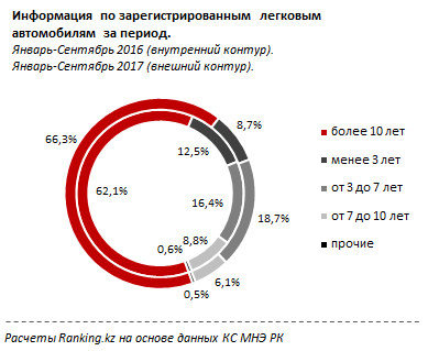 Казахстанцы покупают более дешевые подержанные автомобили. Объем зарегистрированных легковых автомобилей старше трех лет за год вырос с 87,5% до 91,3%.