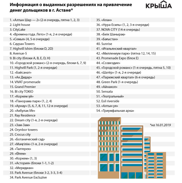 Управление архитектуры Астаны обновило список жилых комплексов, в которых разрешено долевое участие, сообщает krisha.kz.