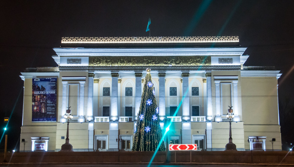 Новогодней достопремичательностью стала и площадь перед Казахским Государственным Академическим театром оперы и балета имени Абая.
